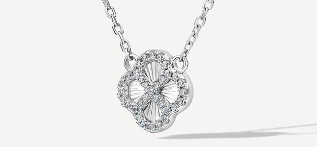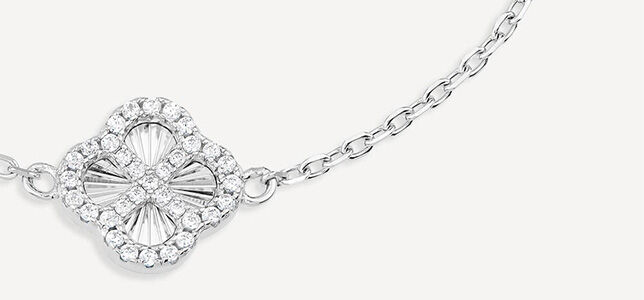 Surrounded by brilliant, sparkling cubic zirconia, this cool-toned silver necklace works effortlessly styled with simple chains to create a layered look. The lucky charm symbolism makes a thoughtful gift to connect a group of friends, letting each person style the necklace in their own unique way.
