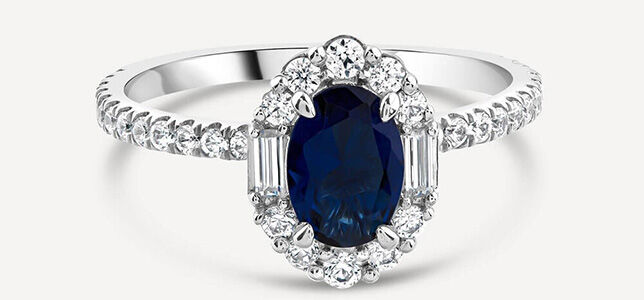 For those who prefer colour and find traditional diamond solitaires too predictable, this stunning sapphire centre ring offers something completely different. The royal blue sapphire is surrounded by a brilliant halo and elegant baguette diamonds (0.48 carats total), creating a unique design that’s for someone who marches to their own beat and wants their engagement ring to reflect their individual style.