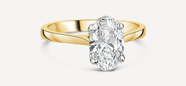 This clever cluster design arranges diamonds in a marquise shape to create the look of a much larger stone. Set in 18ct yellow gold with additional diamonds in the band, it offers incredible sparkle at an accessible price. It’s an ideal choice for couples who don’t want to compromise on beautiful craftsmanship to achieve something really special.